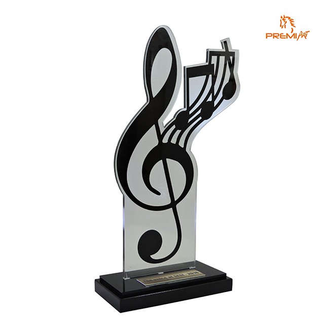 Troféu personalizado, feito de acordo com as preferências e evento do cliente. Peça em acrílico com base em MDF e plaqueta de identificação.