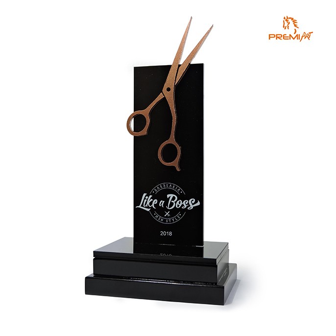 Troféu personalizado, feito de acordo com as preferências e evento do cliente. Peça em acrílico com base em MDF, detalhes serigrafados.